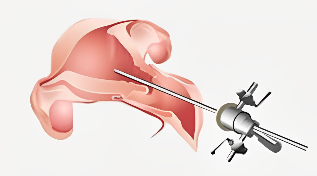 • L’intervention, qui se déroule par les voies naturelles, permet dans un premier temps de visualiser directement l’intérieur de la cavité utérine afin de préciser le diagnostic et les possibilités de traitement (hystéroscopie diagnostique). Un tube muni d’une optique est introduit par le canal du col utérin et un liquide est injecté dans la cavité utérine pour permettre la visualisation. • L’hystéroscopie opératoire peut permettre de traiter certaines anomalies de la cavité utérine confirmées par l’exploration (fibromes, polypes, anomalies de la muqueuse, cloisons, synéchies…) à l’aide d’instruments et/ou d’un bistouri électrique, toujours par les voies naturelles.